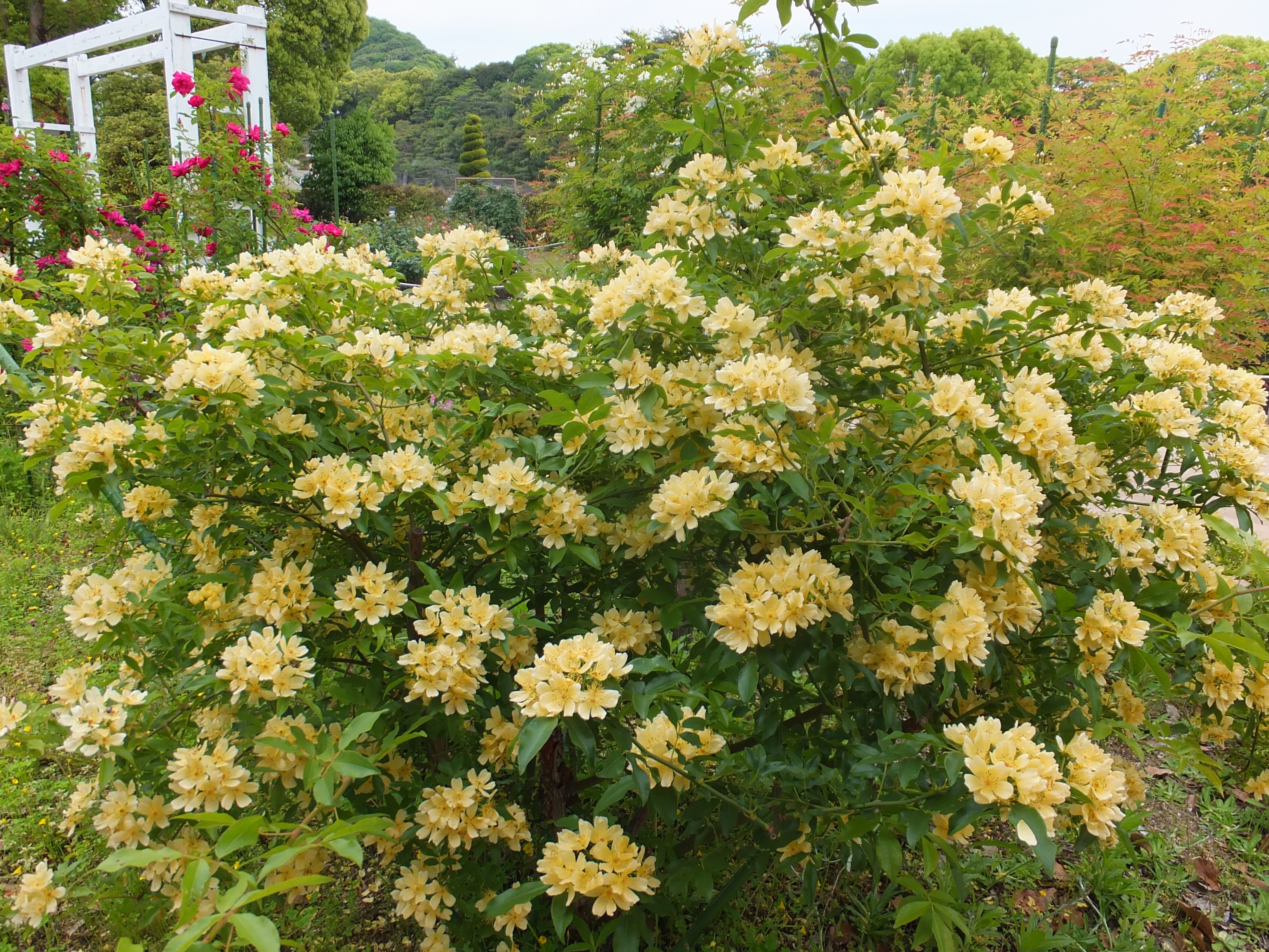 中国原産で黄色の一重の花が咲く早咲きの一季咲きで、花つきが多いバラだそうです。