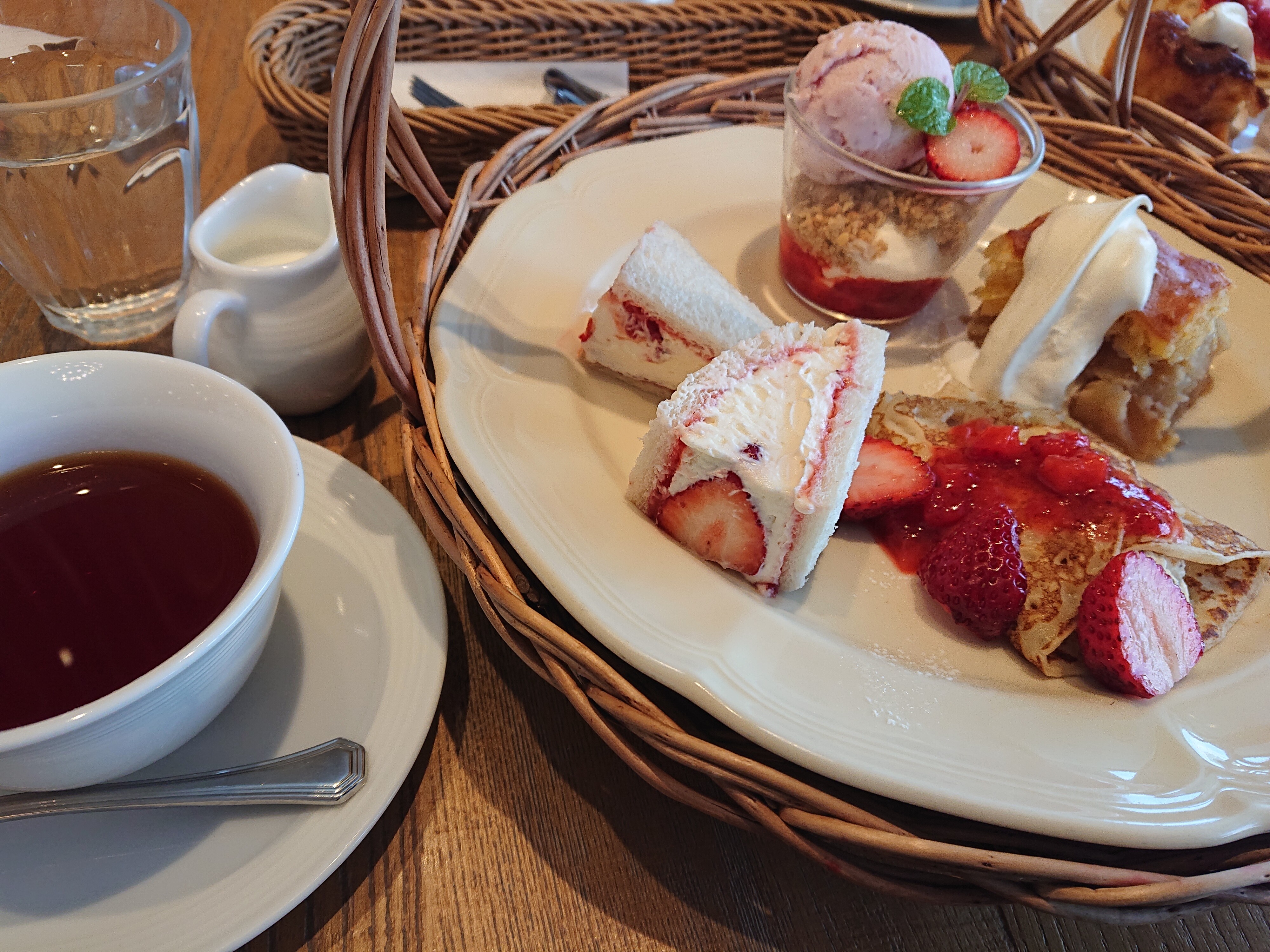 季節限定の苺のスイーツ3品+選べるスイーツ1品とお好みのお茶が楽しめる、