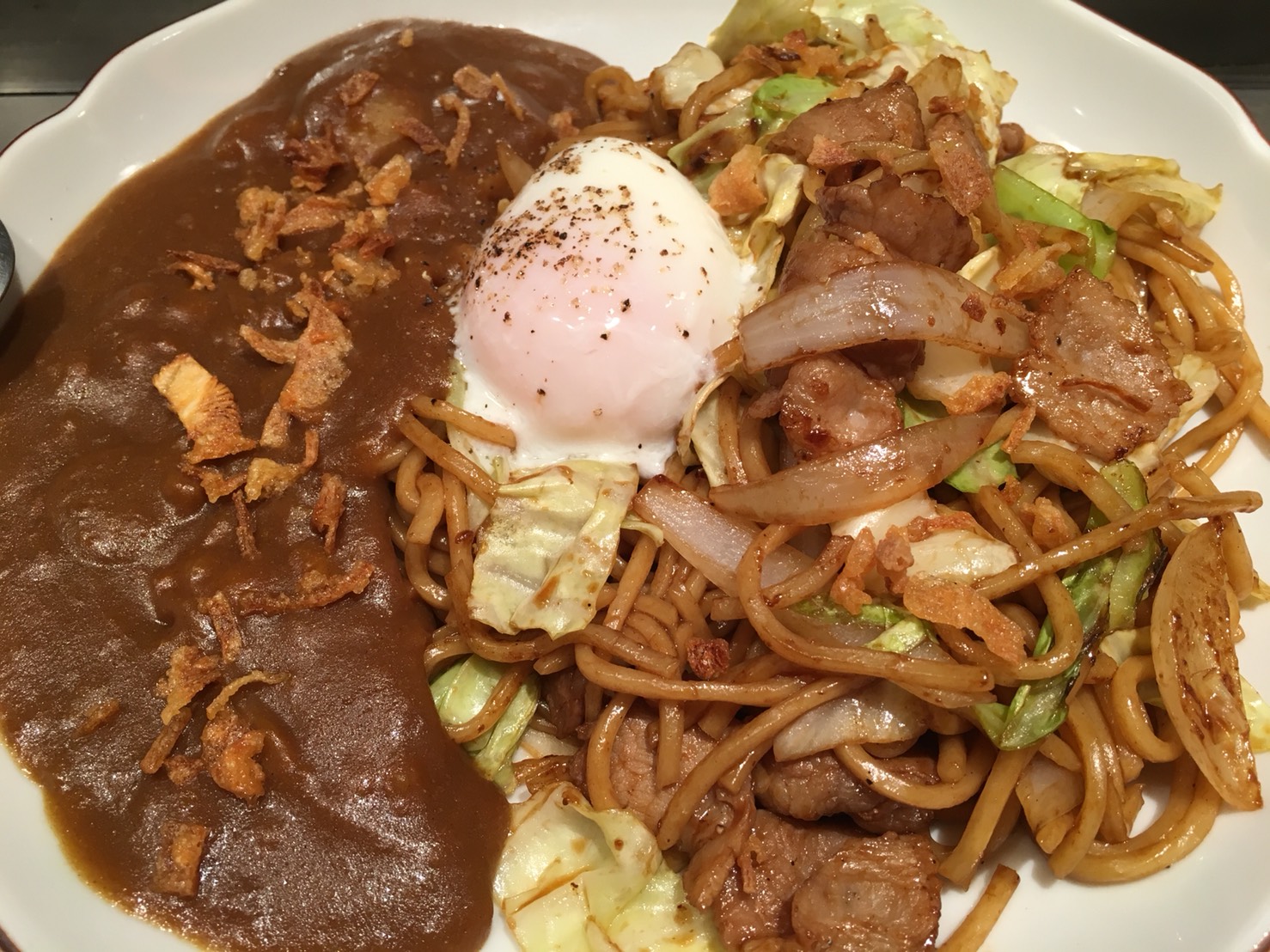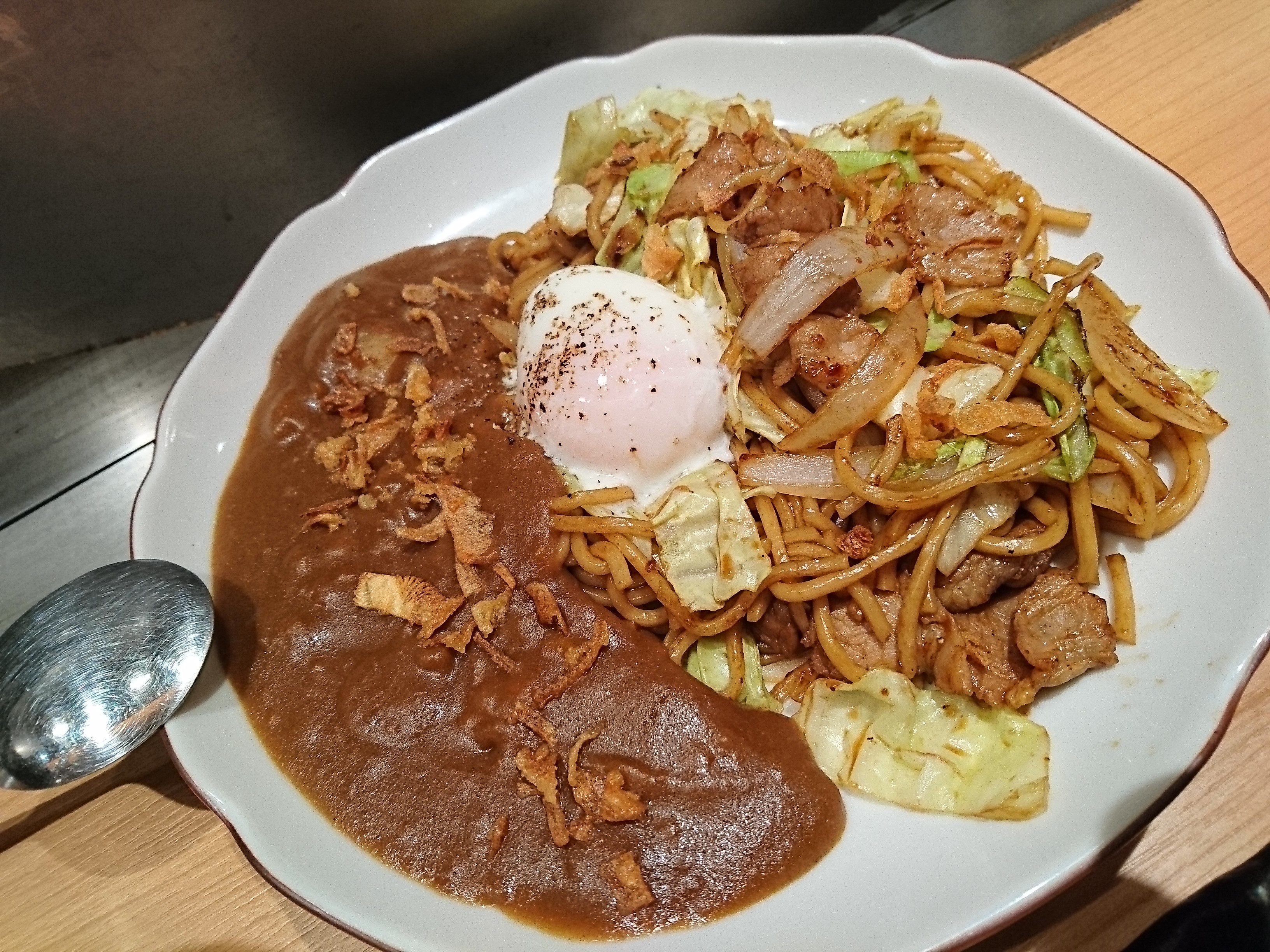 焼きそばとカレーのマリアージュに、温玉とオニオンフライがトッピングされていました。