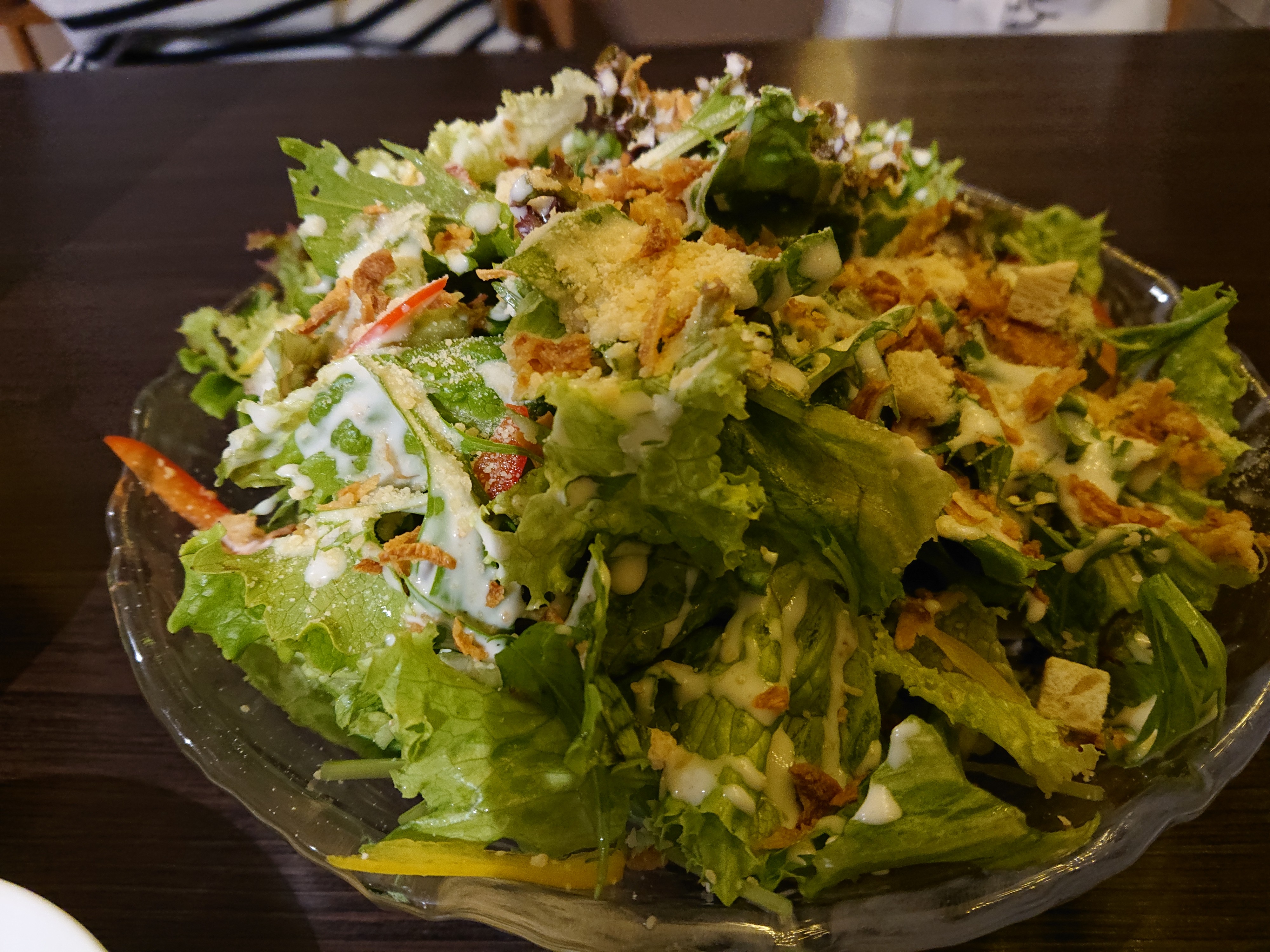 サラダ、フライドポテト、ガーリックチップスが添えられており、100gでも食べごたえ十分でした。