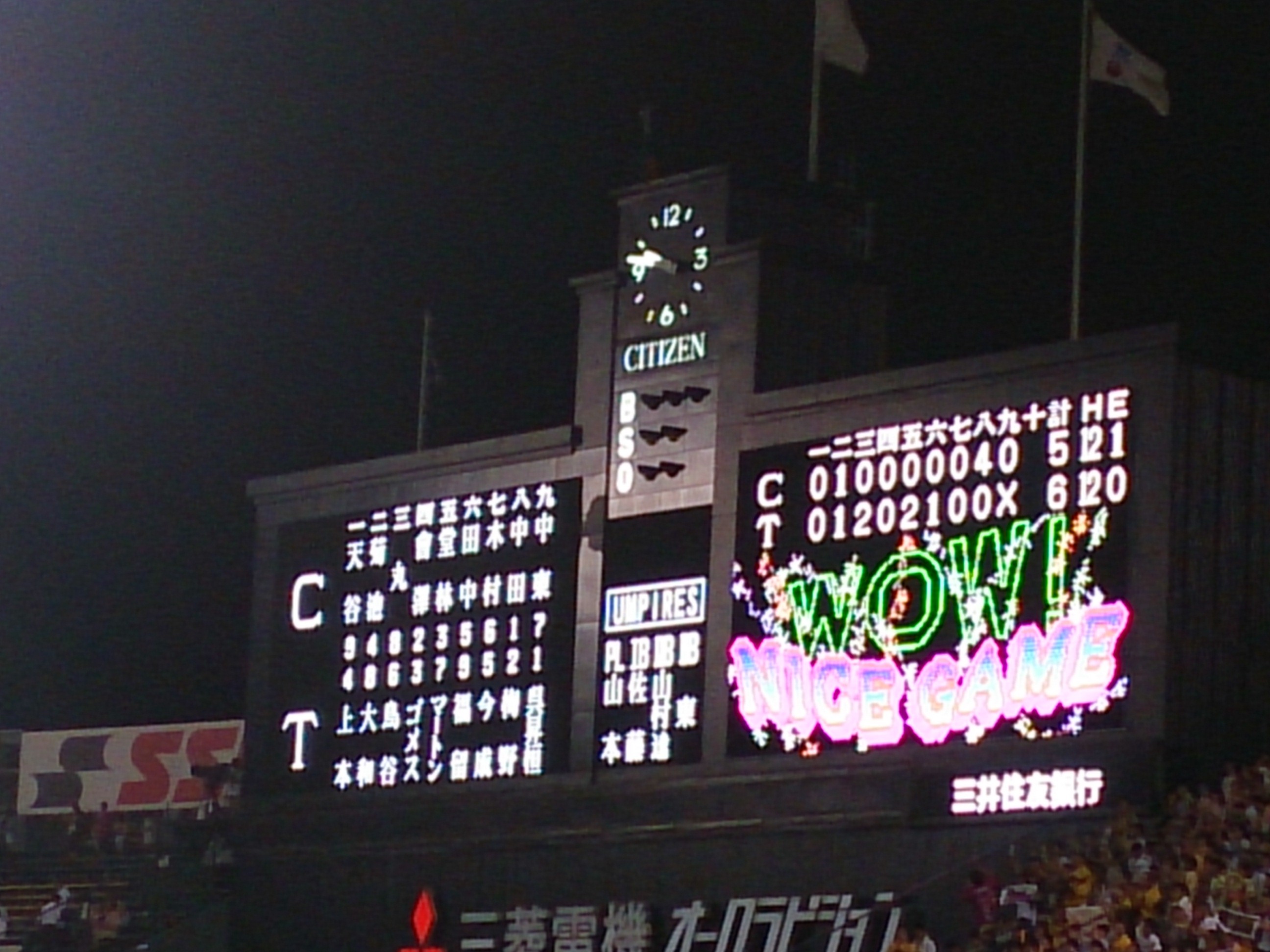 2014年07月09日 甲子園~'14.7月①阪神vs.広島 台風が接近してるなか、雨とか風とか心配だったけど、何とか試合は開催された🏟⚾ 蒸し暑かったけれど、球場は風があって涼しかった~ 写真はブレブレ(蒸し暑さのせい?) 今日はライトスタンドからの観戦📢 私が行く試合、かなり負けが込んでたけど、今日はやっと勝った🎉 カープに勝つのって嬉しい♪ まさかまさかの7連勝☆☆☆☆☆☆☆ タグ :#甲子園#阪神タイガース#台風接近#蒸し暑い#ライトスタンド#カープ#7連勝 「阪神タイガース」カテゴリの最新記事 < 前の記事次の記事 > コメント コメントフォーム 名前 コメント 評価する リセット リセット 顔 星 投稿する 情報を記憶 トラックバック