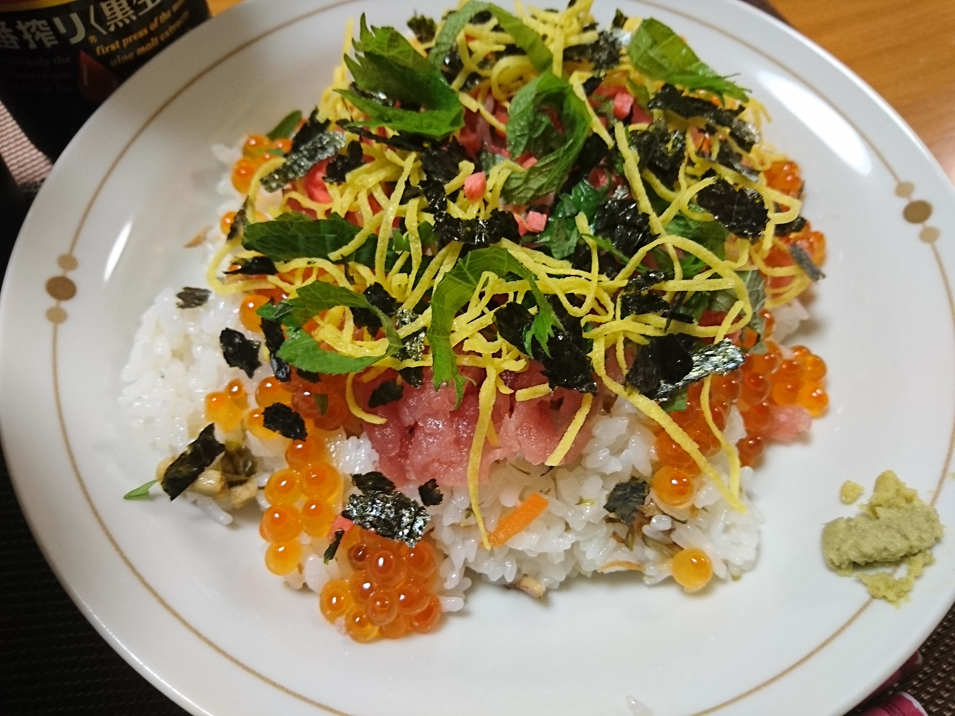 まぐろ、サーモン、いくら、紅生姜、大葉、錦糸卵、もみ海苔を散らしました。