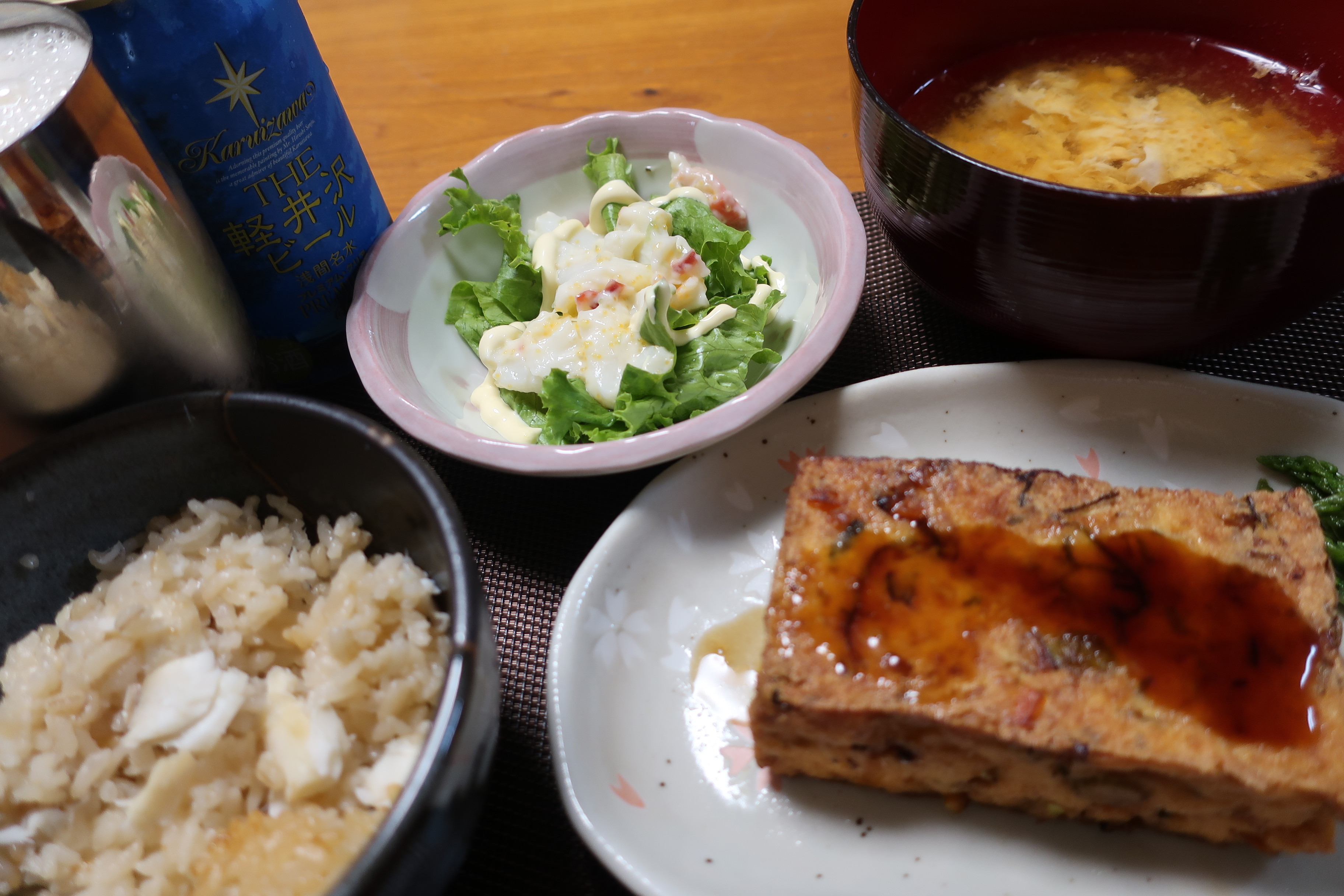 野菜入りの厚揚げステーキと、卵とじのおすまし、ホッキ貝のサラダと。