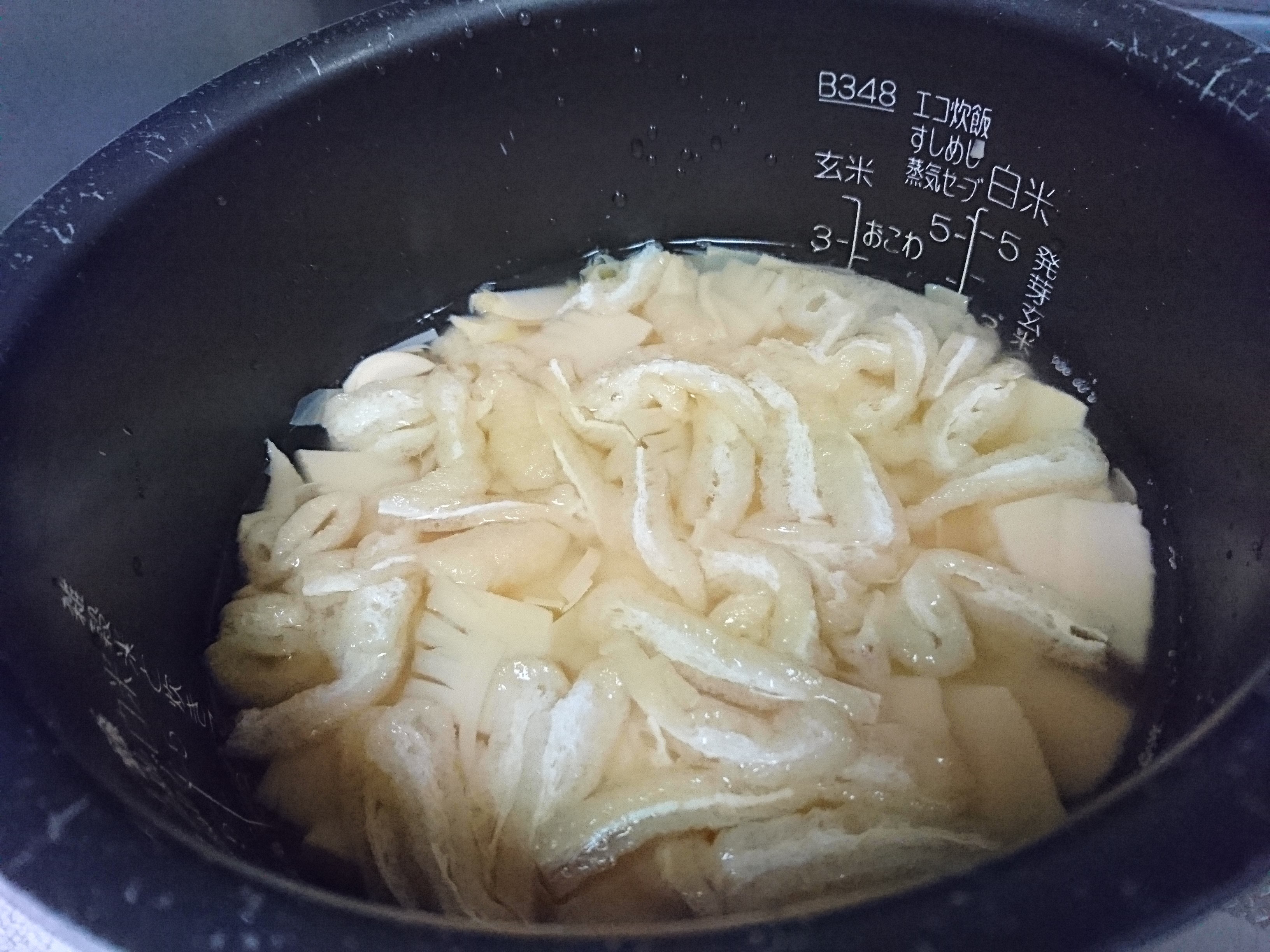 ②炊飯釜にお米、刻んだ薄揚げ、昆布を入れ、茹で汁ごと筍を入れ、二合より少し下のラインまで水を足し、炊飯ボタンを押す。