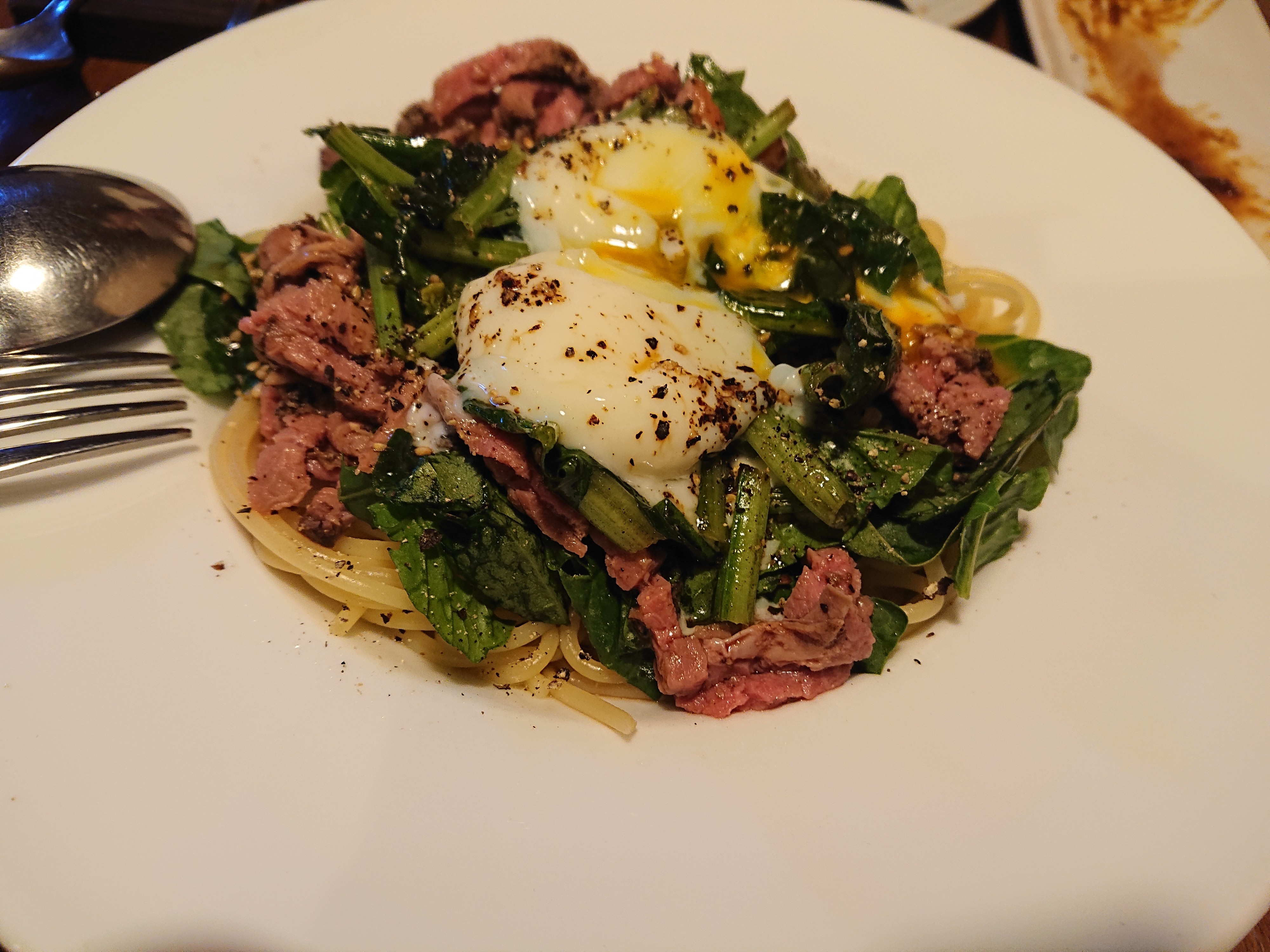 ローストビーフとほうれん草、そして半熟卵は色取りも綺麗。