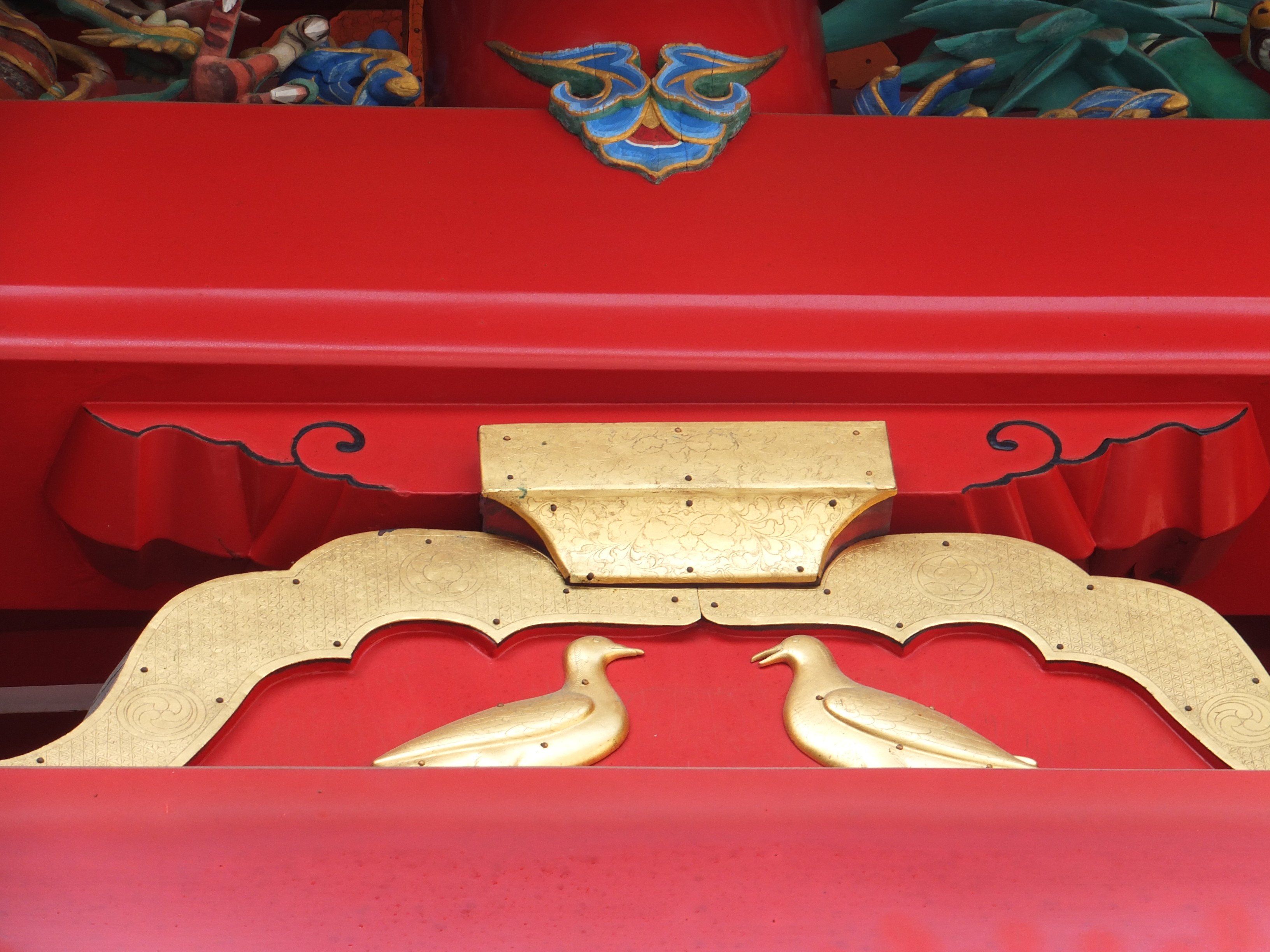 社殿の顔である楼門の正面には、蟇股部分に一対の向かい合う鳩の錺金具(かざりかなぐ)があり、