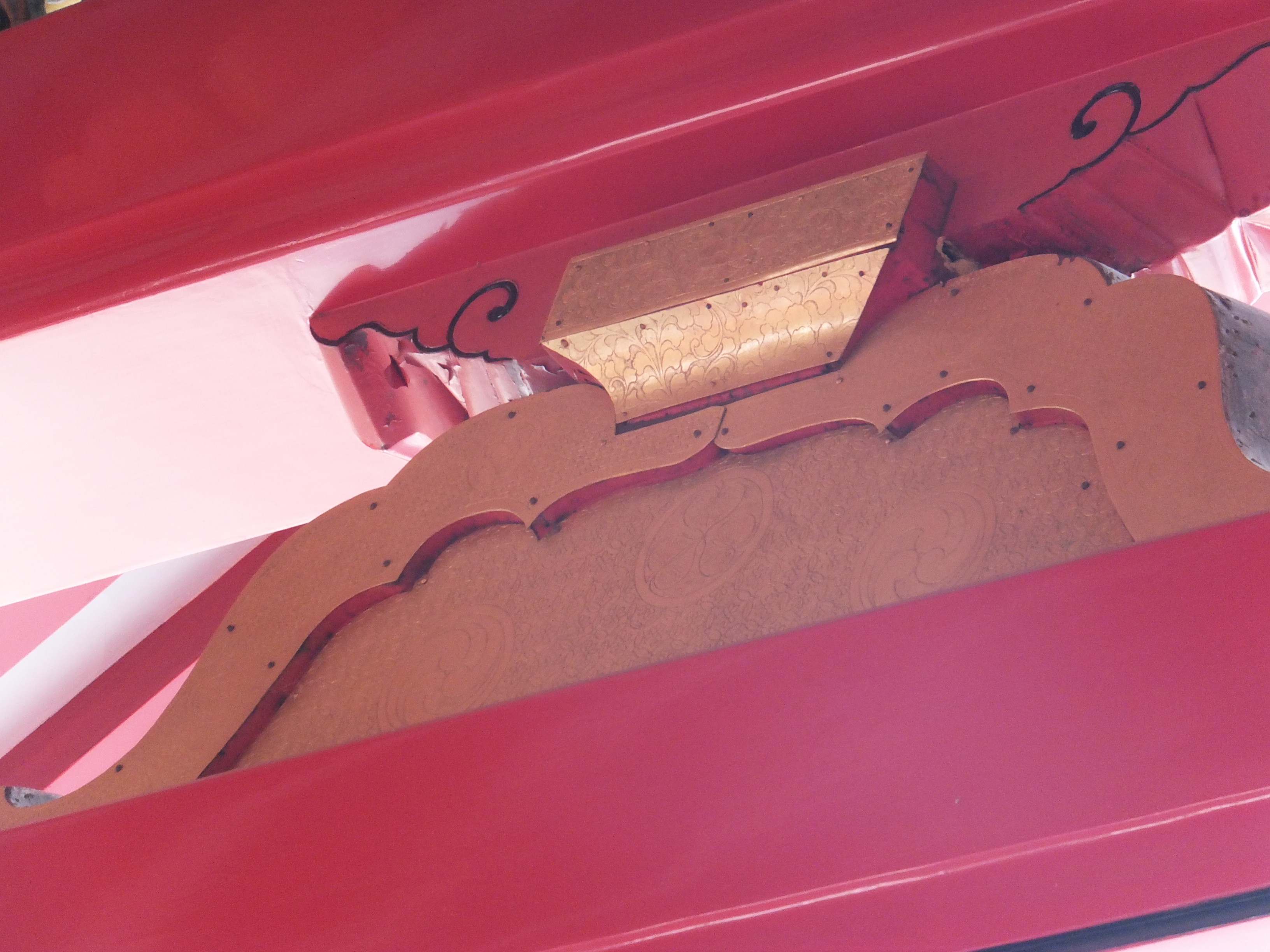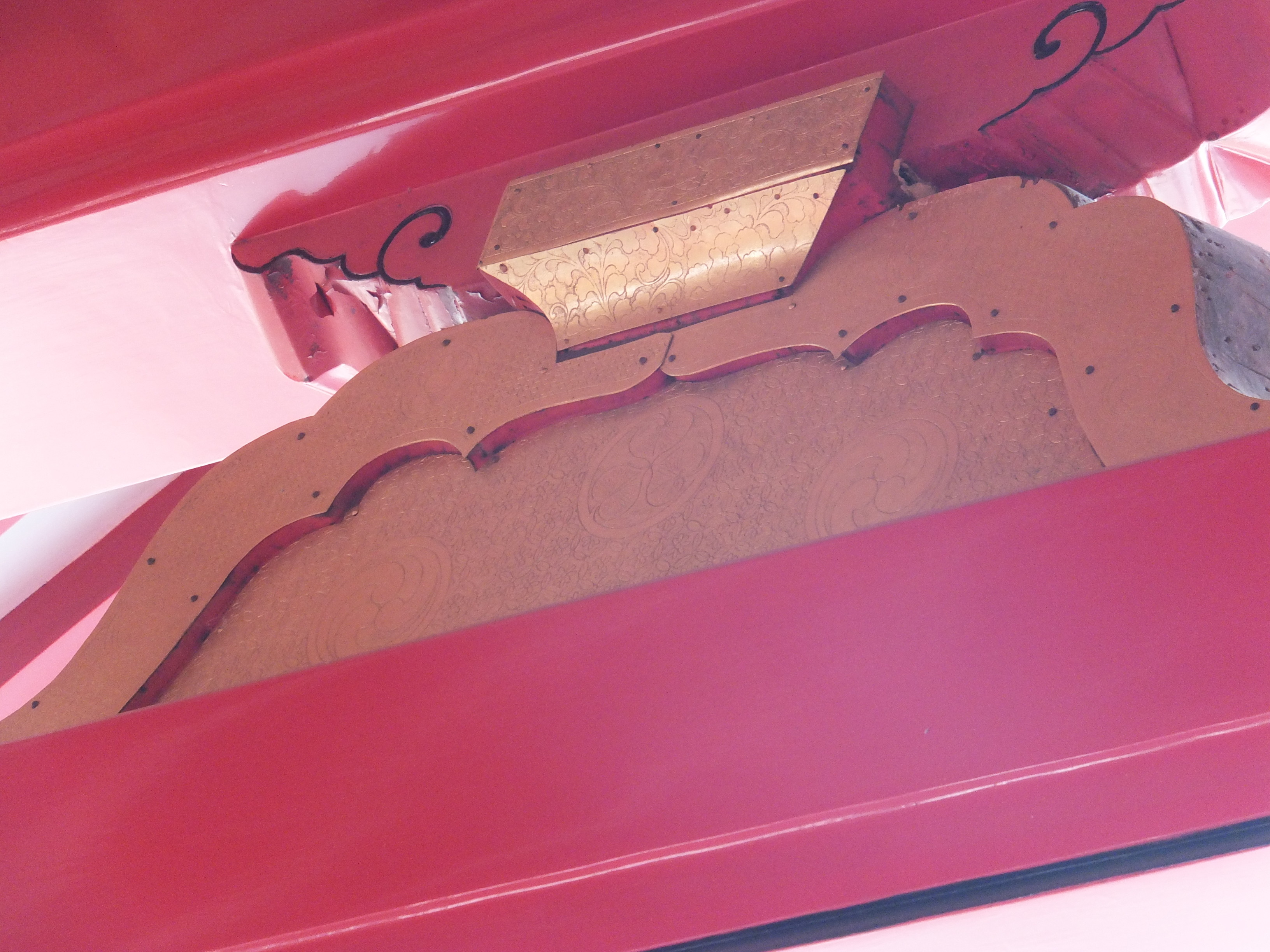 楼門蟇股部分、正面の双鳩(錺金具)の裏側に、「葵の御紋」が、錺金具に彫られています。