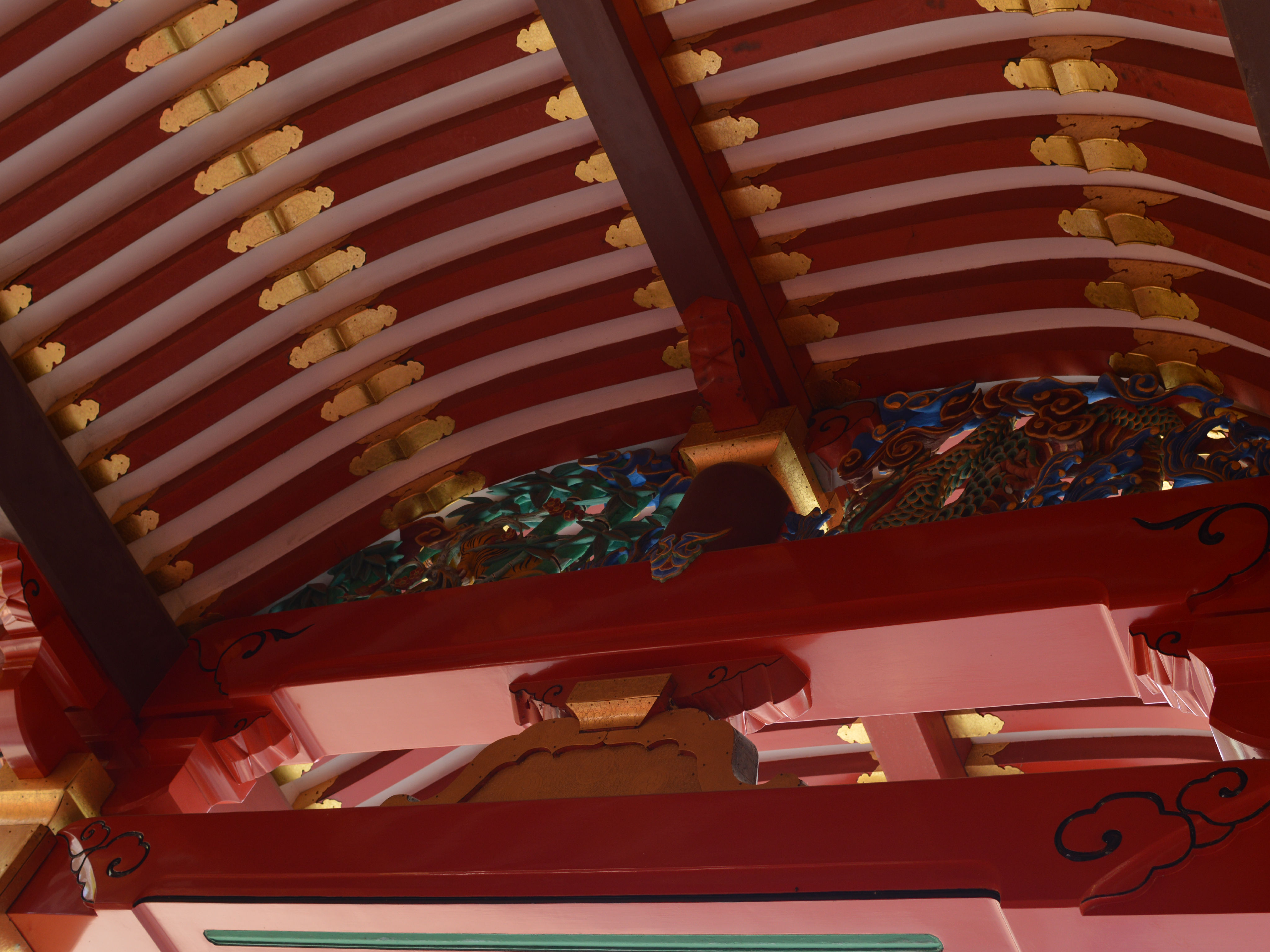 社殿の建造物全てが丹漆塗で、随所に壮麗な極彩色彫刻が施されています。