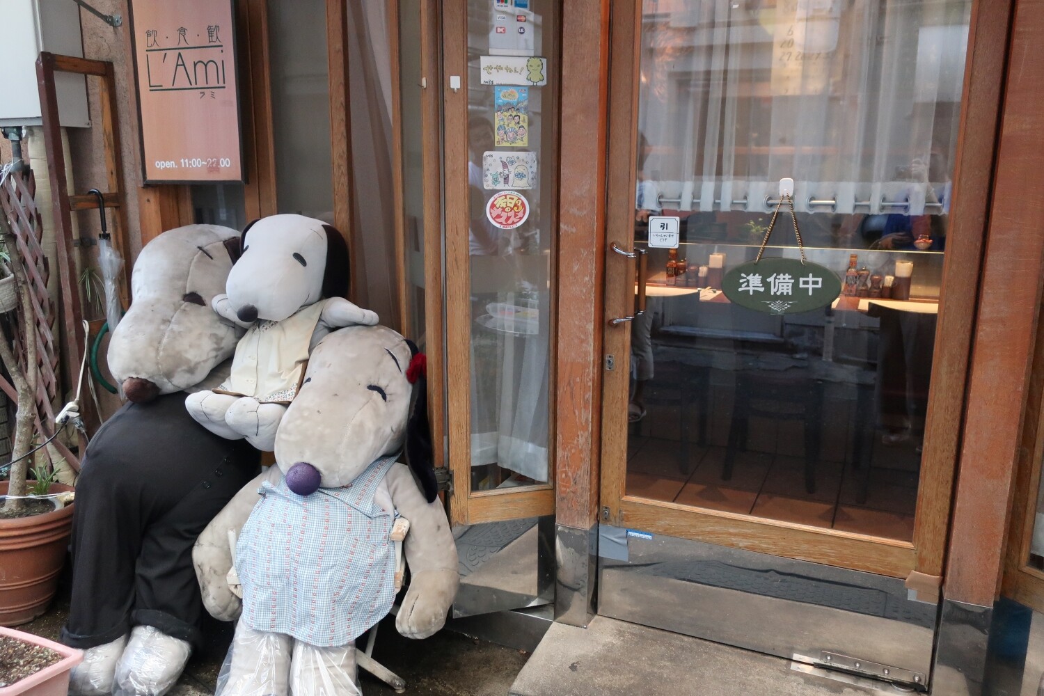 お店の看板と共にスヌーピーの大きなぬいぐるみもお出迎え♡