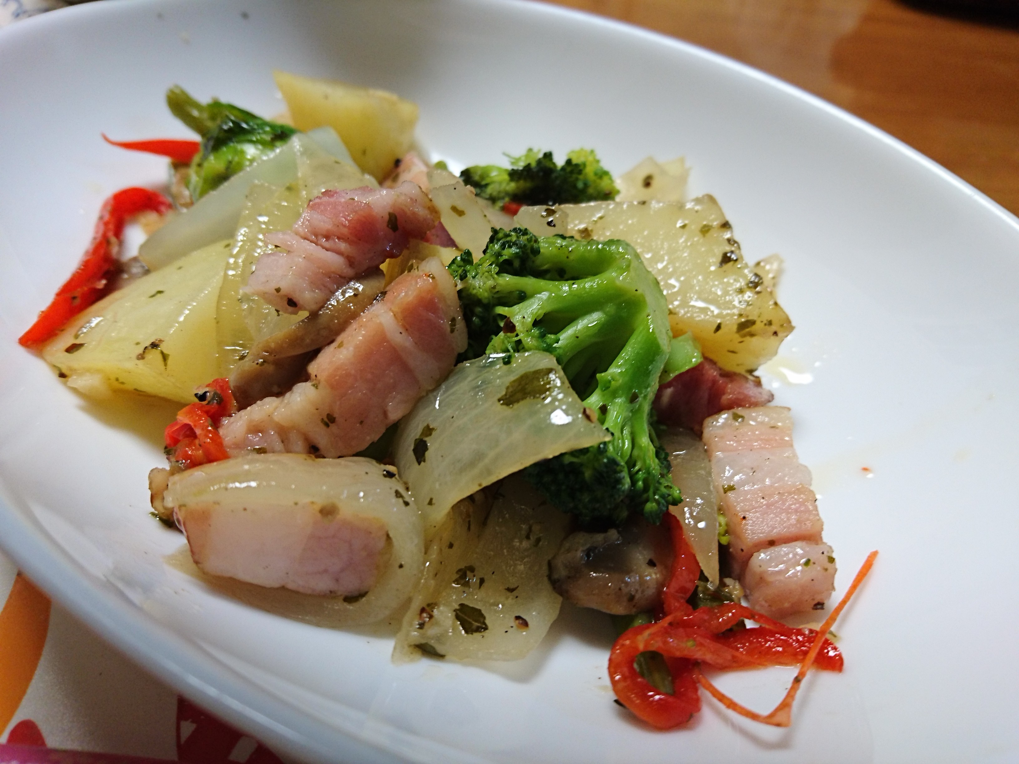 厚切りベーコンと、じゃがいも、玉ねぎ、芽キャベツ、マッシュルーム、赤ピーマン、インゲン。