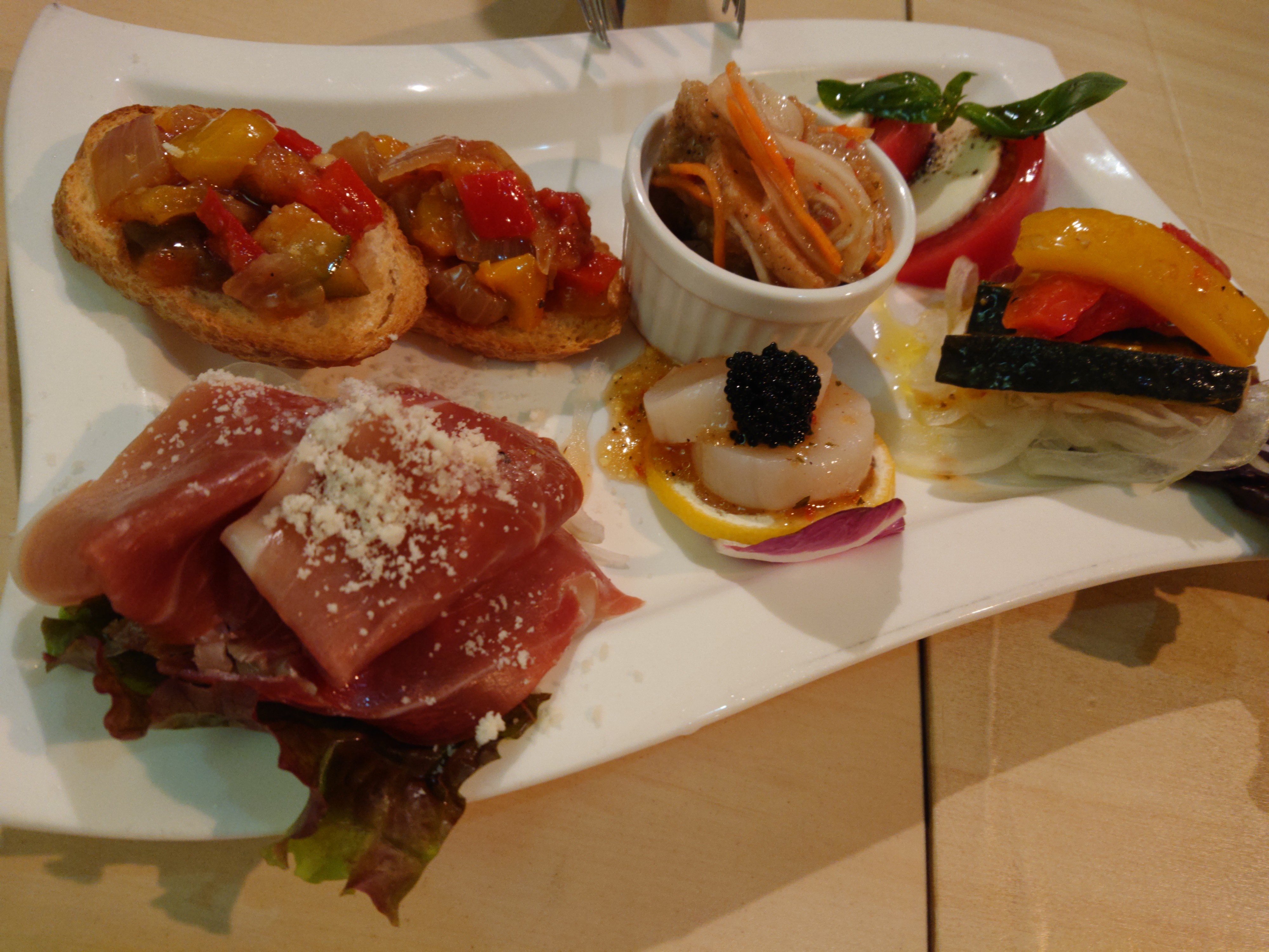 生ハム、カプレーゼ、ブルスケッタ、帆立貝柱とキャビアのカルパッチョなど、6種類の盛り合わせ。
