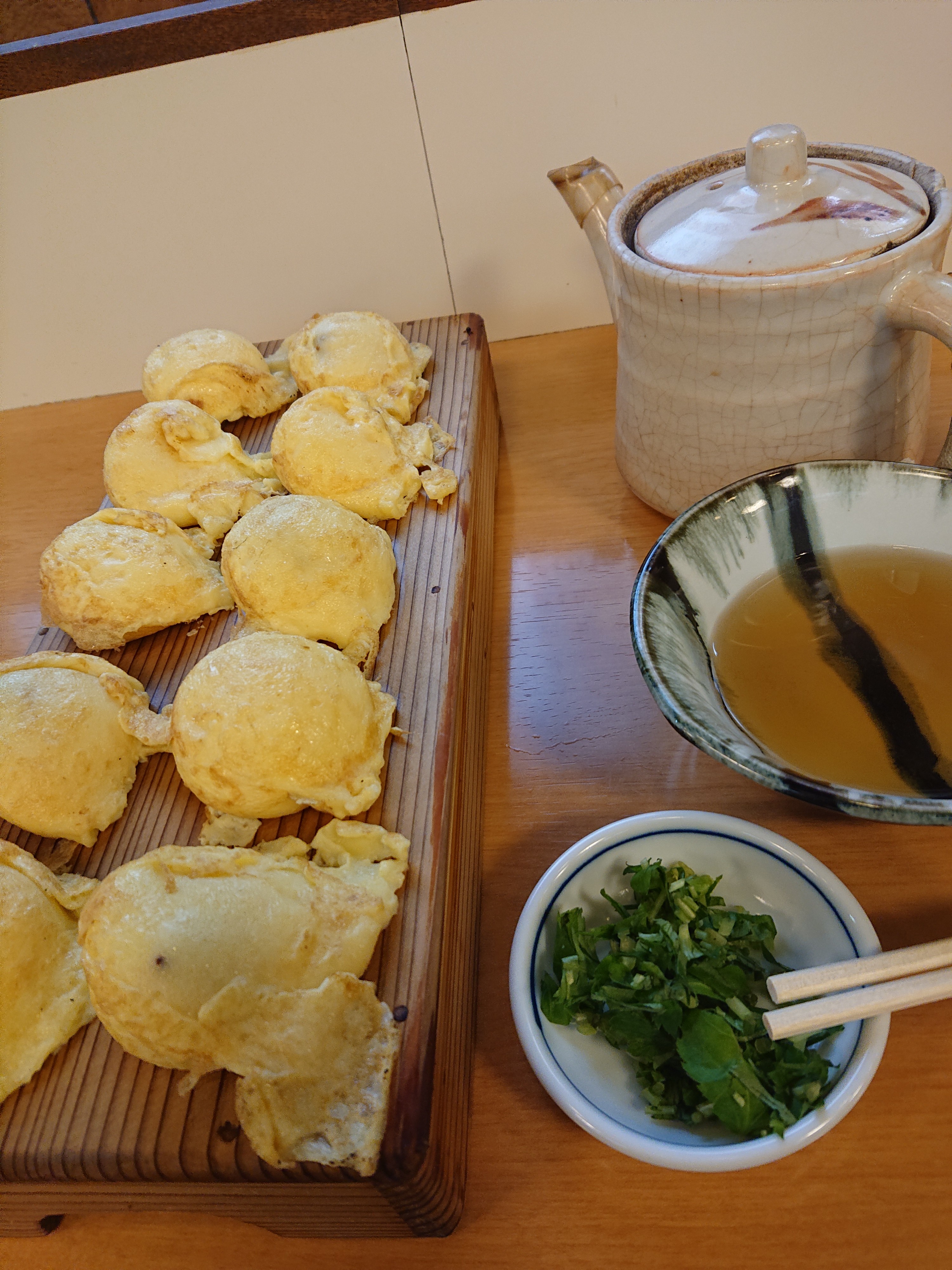 先に、出汁が入った急須と、刻まれた三つ葉と器が運ばれてきます。