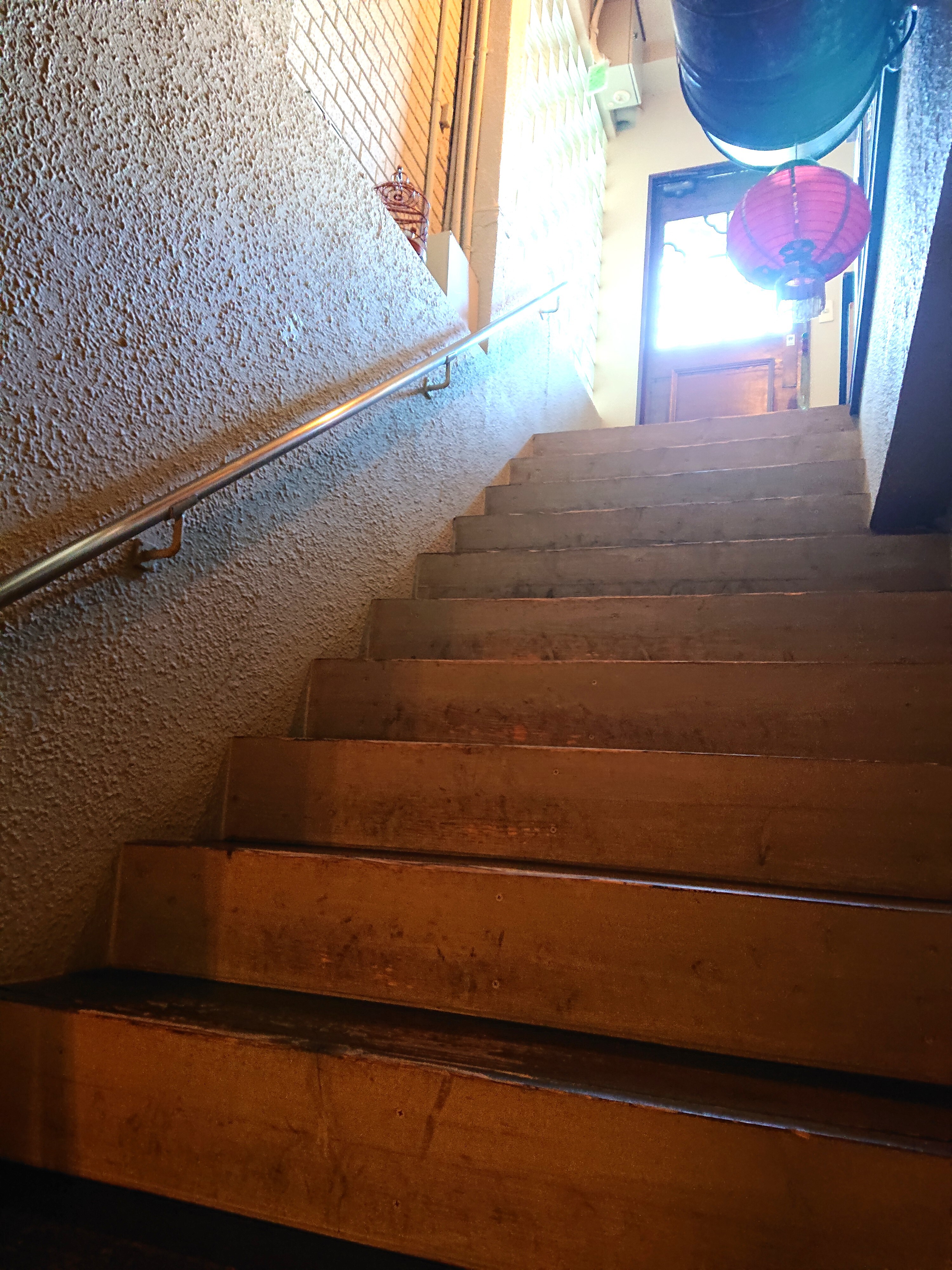 ドアを開けると、地下に降りる細い階段があります。