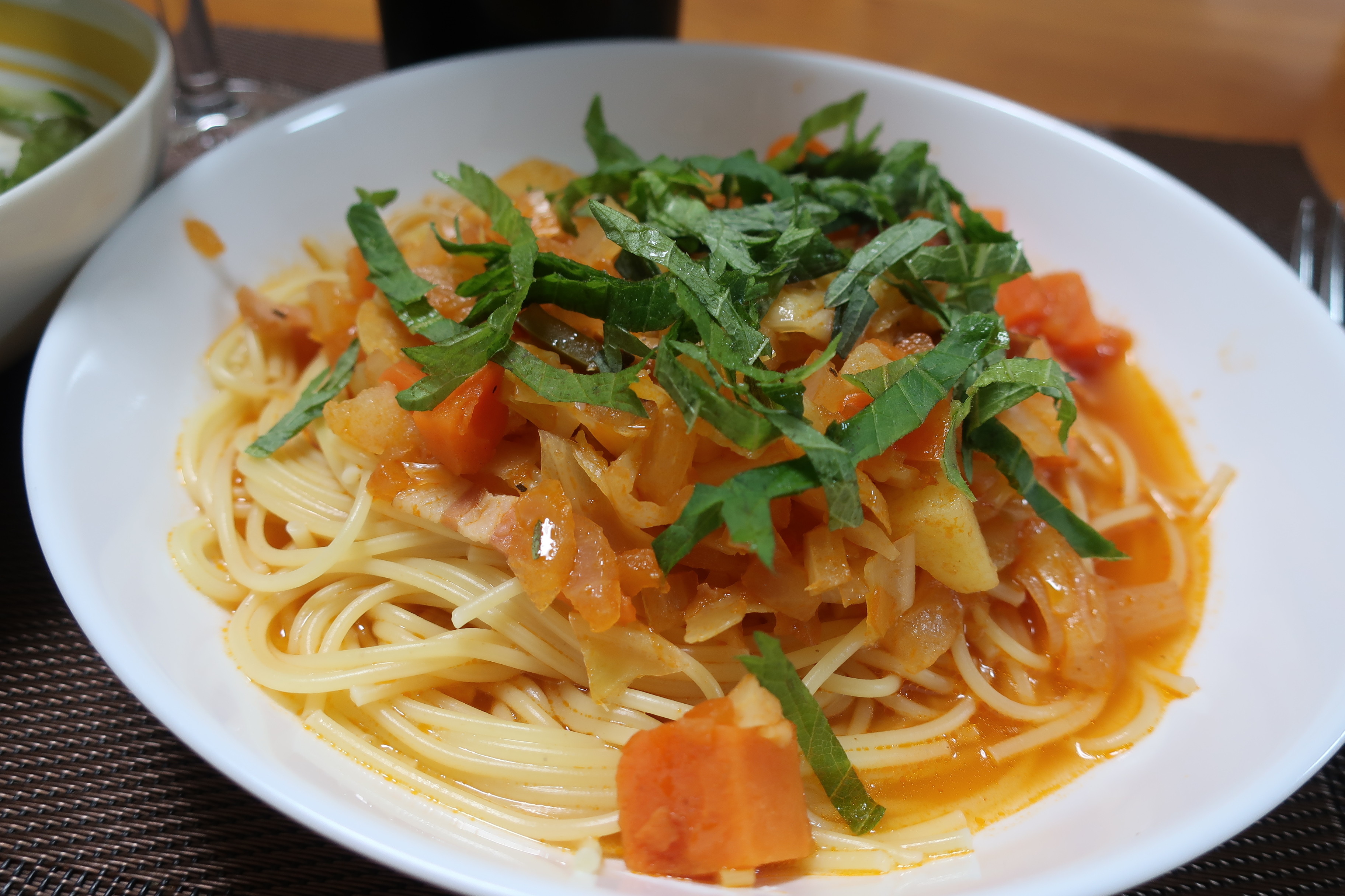 トマト風味のスープパスタを作りました。