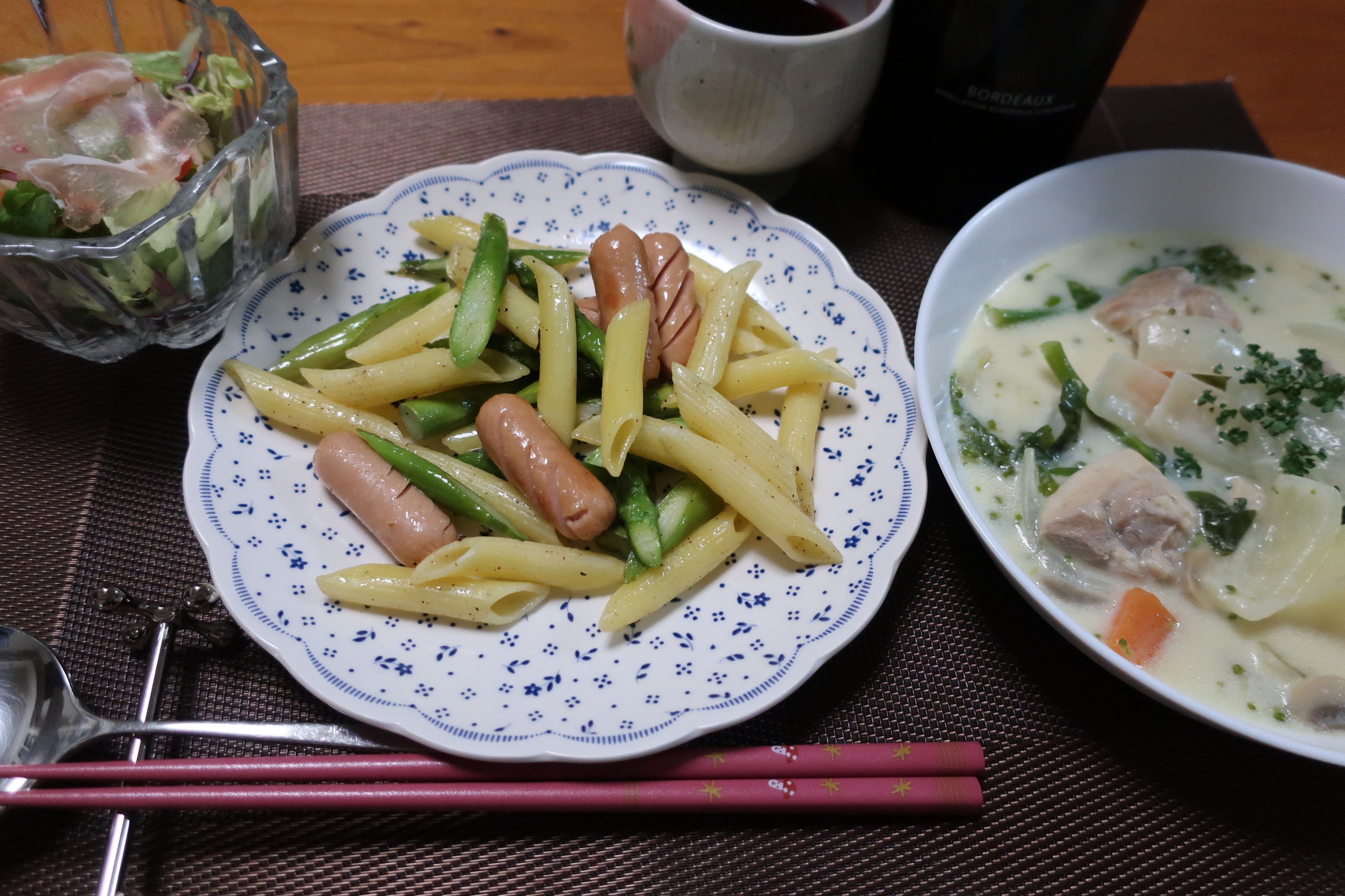 菜の花クリームシチュー&ペンネのウインナーとグリーンアスパラ炒め