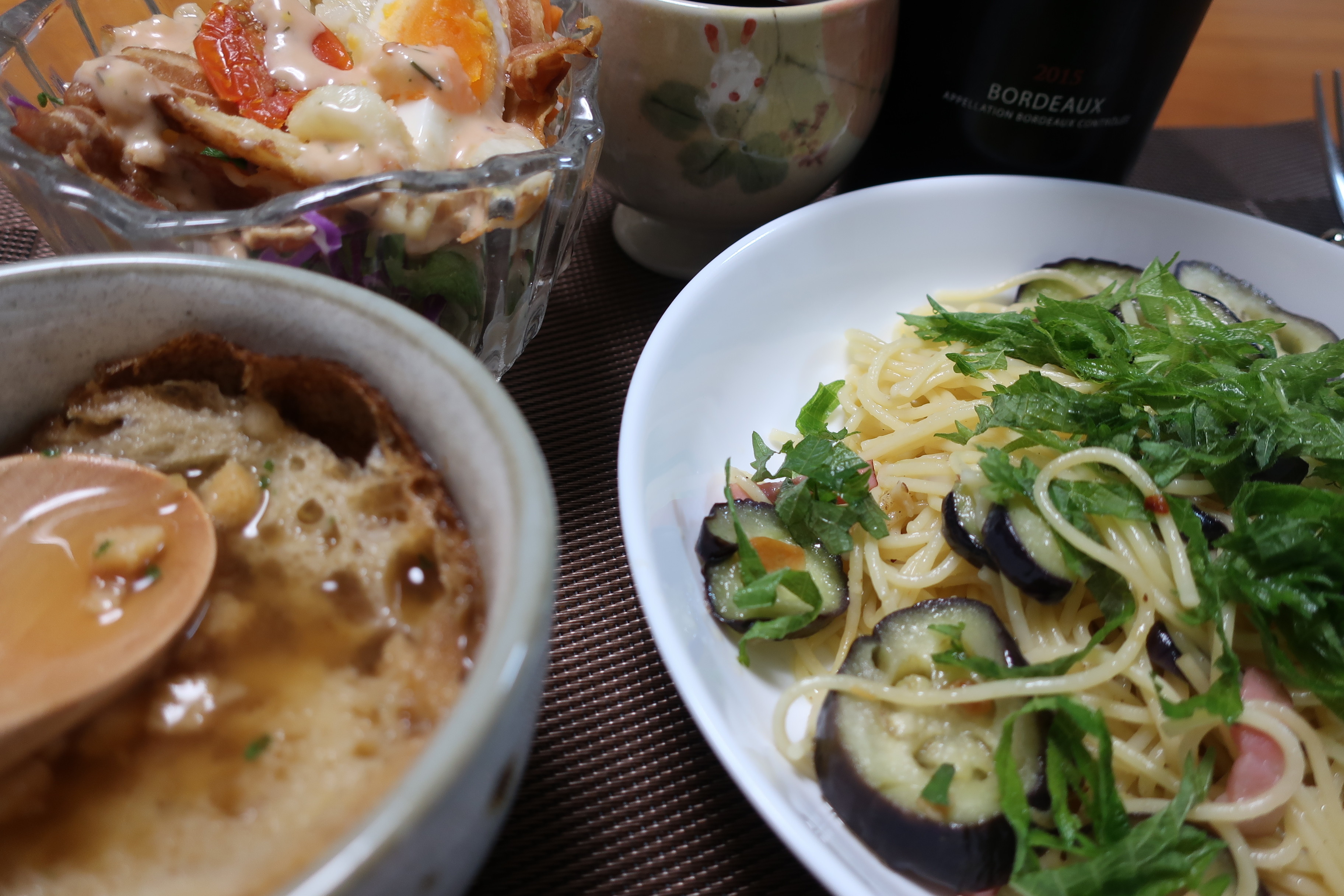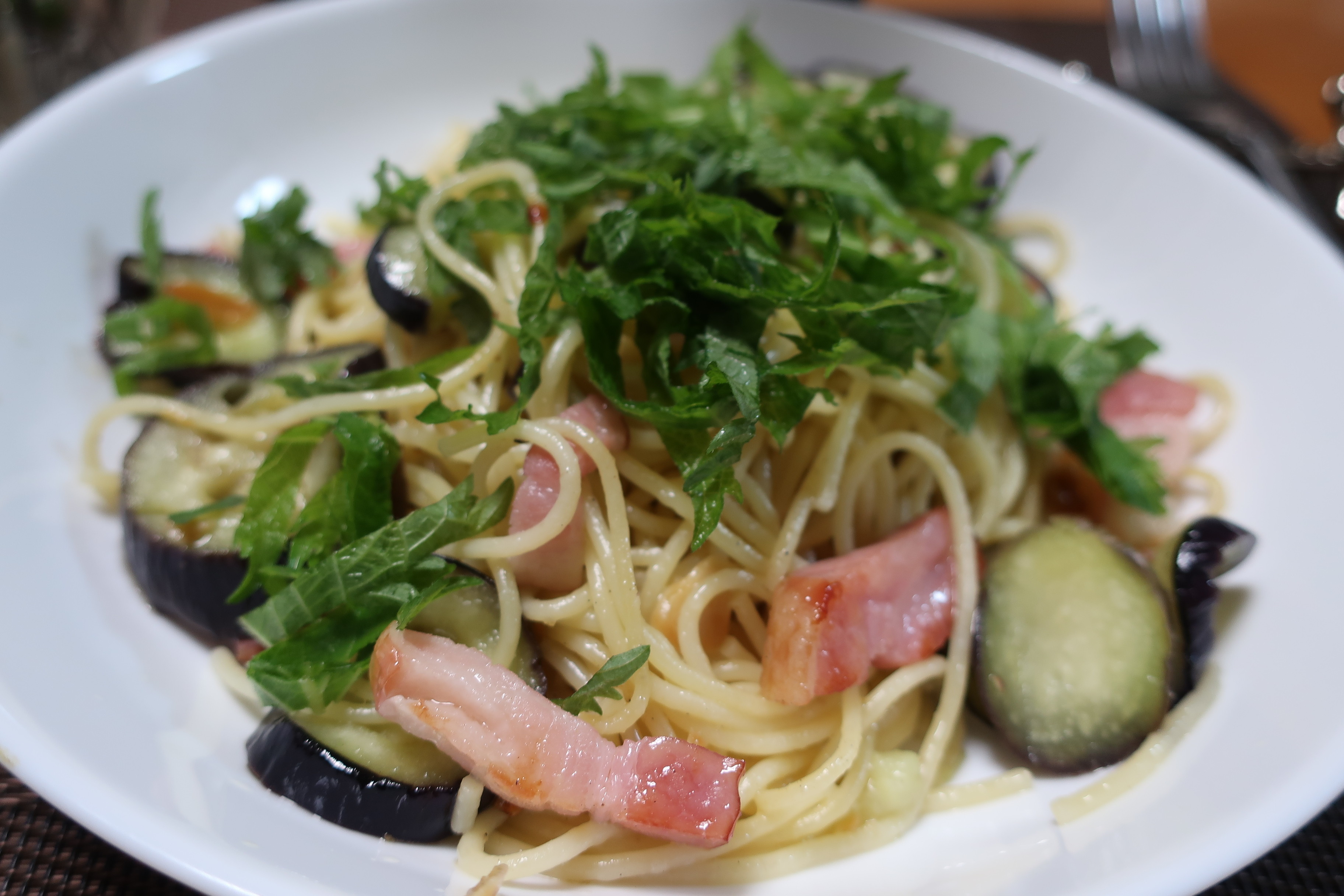 茄子とベーコンと大葉のガーリックオイルパスタ