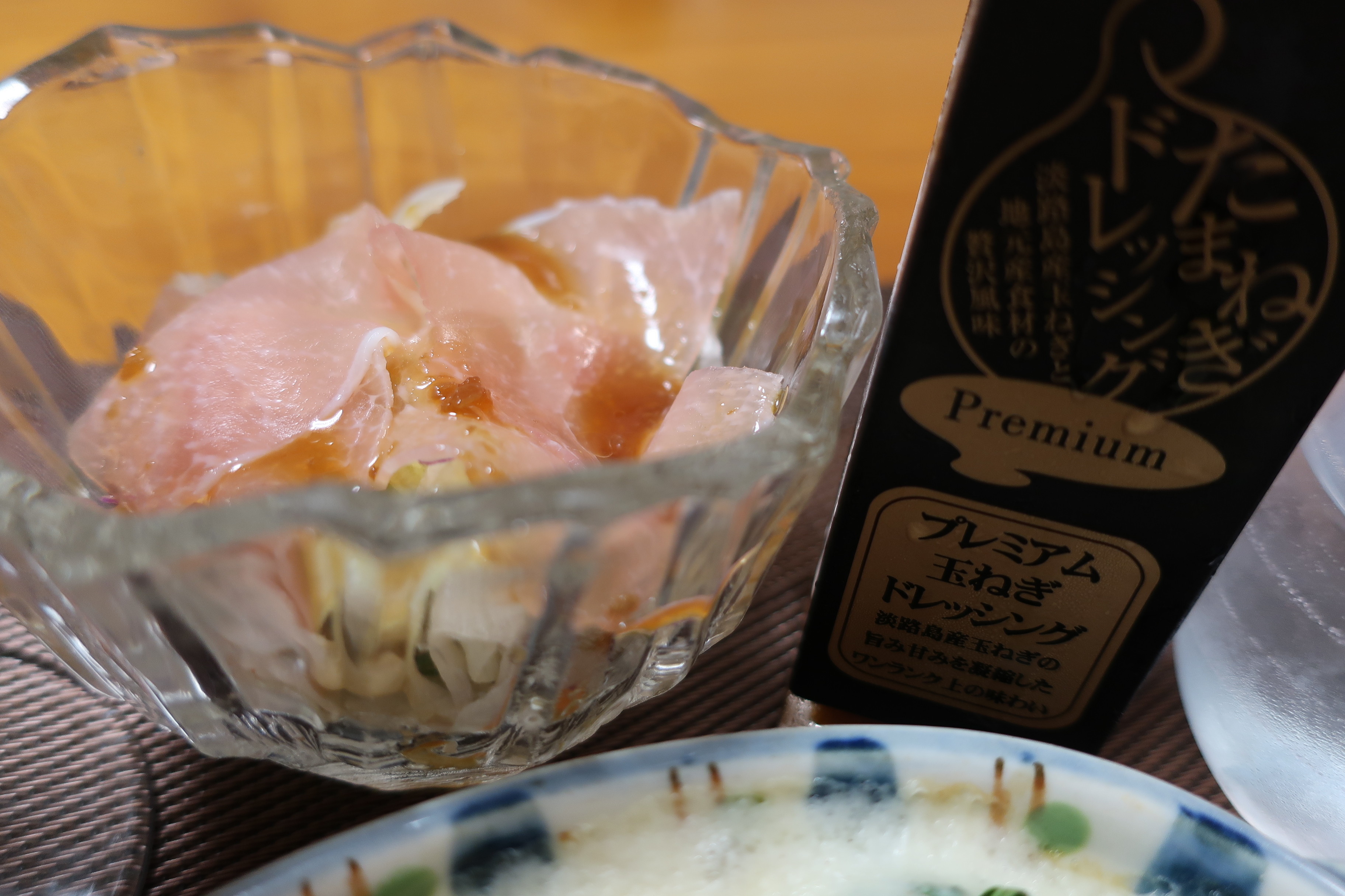 ドレッシングは、淡路産の「プレミアム玉ねぎドレッシング」。